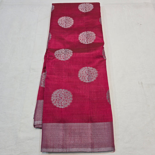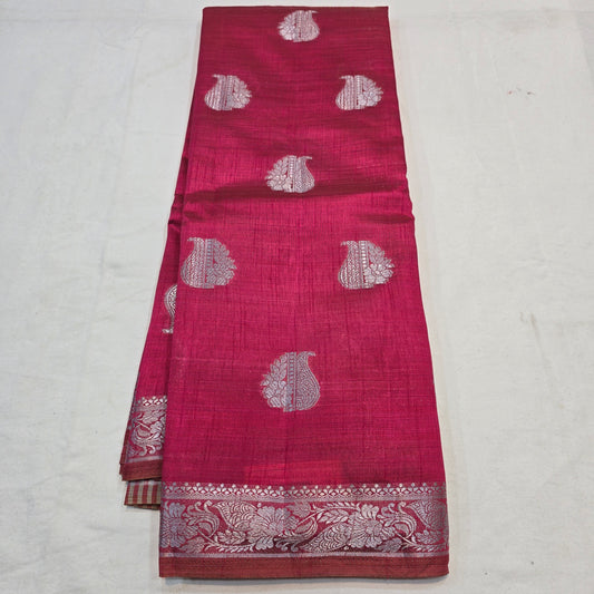 Dark Pink Tussar Fancy Saree with Silver Zari Checks & Striped Pallu