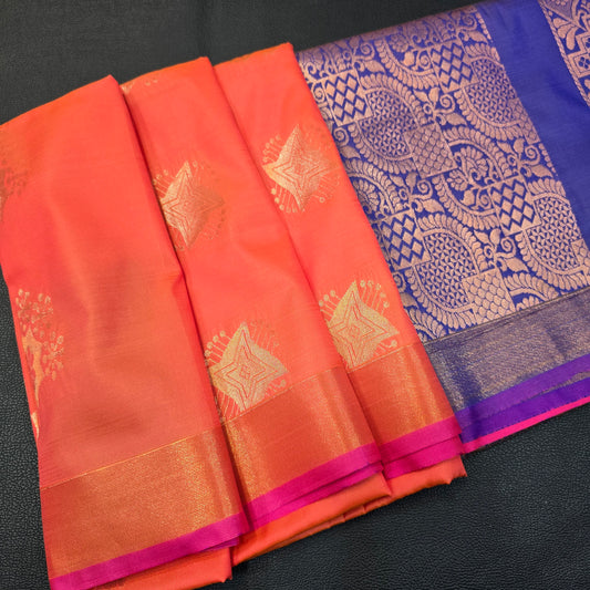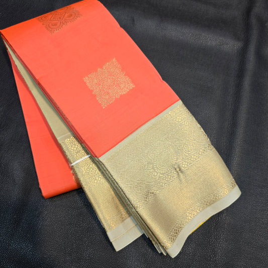 Coral Orange Kanchipuram Semi Silk Saree with Grand Antique Gold Zari Border