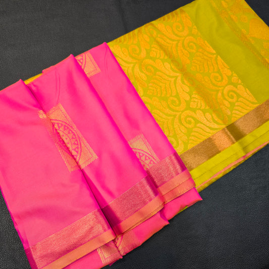 Hot Pink & Parrot Green Semi Silk Saree with Rich Gold Zari Brocade Pallu | Festive & Wedding Wear