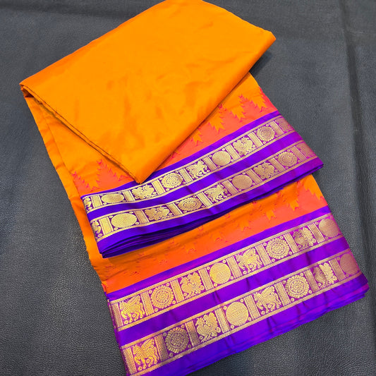 10 YARDS Pure Silk Orange & Royal Purple Kanchipuram Saree with Traditional Zari Border