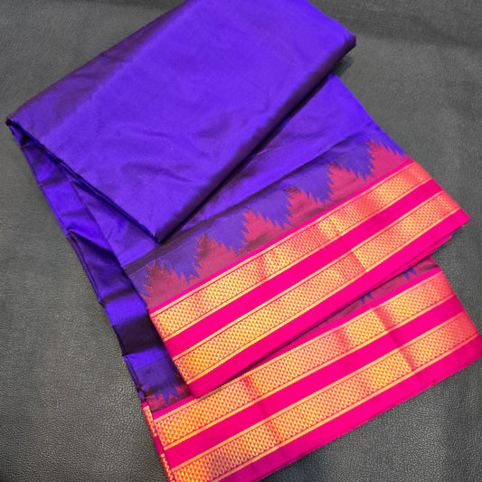 Authentic Kanchipuram Pure Silk 10-Yard Saree – Royal MS Blue and Rani Pink with Temple Border and Geometric Zari Pallu