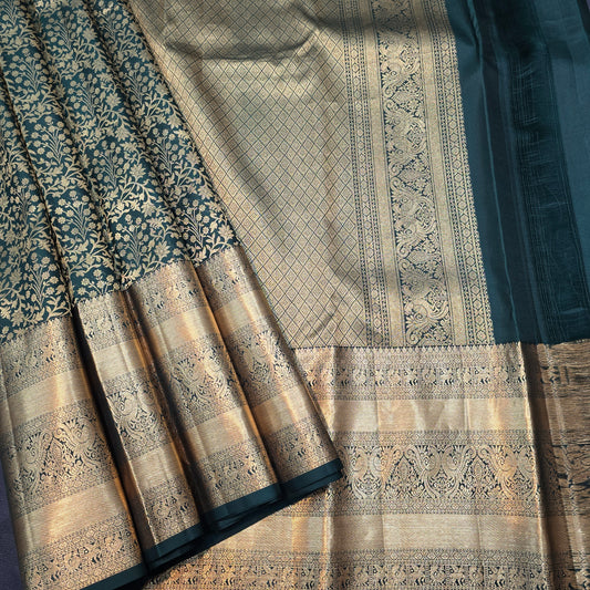 Bottal Green with Gold Floral Jaal Kanchipuram Pure Handloom Silk Saree in Diamond Brocade Pallu