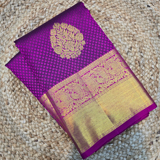 Deep Purple with Gold Zari Buttas Kanchipuram Pure Handloom Silk Saree in and Contrast Pink Pallu
