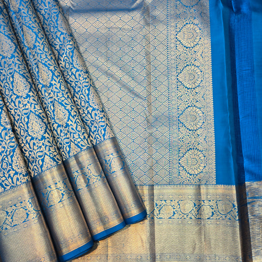 Kanchipuram Pure Handloom Silk Saree in Blue with Rich Gold Zari Brocade Border and Grand Traditional Pallu