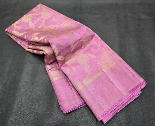 Elegant Semi-Tussar Silk Saree in Dusky Orchid Pink with All-Over Gold Zari Floral Jacquard