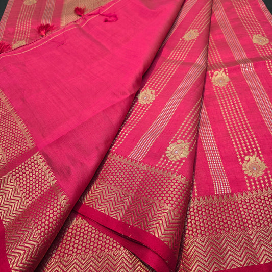 Kanchipuram Pure Fancy Handloom Silk Saree – Rani Pink with Rich Gold Zari Brocade Pallu | Bridal Wedding Silk Saree