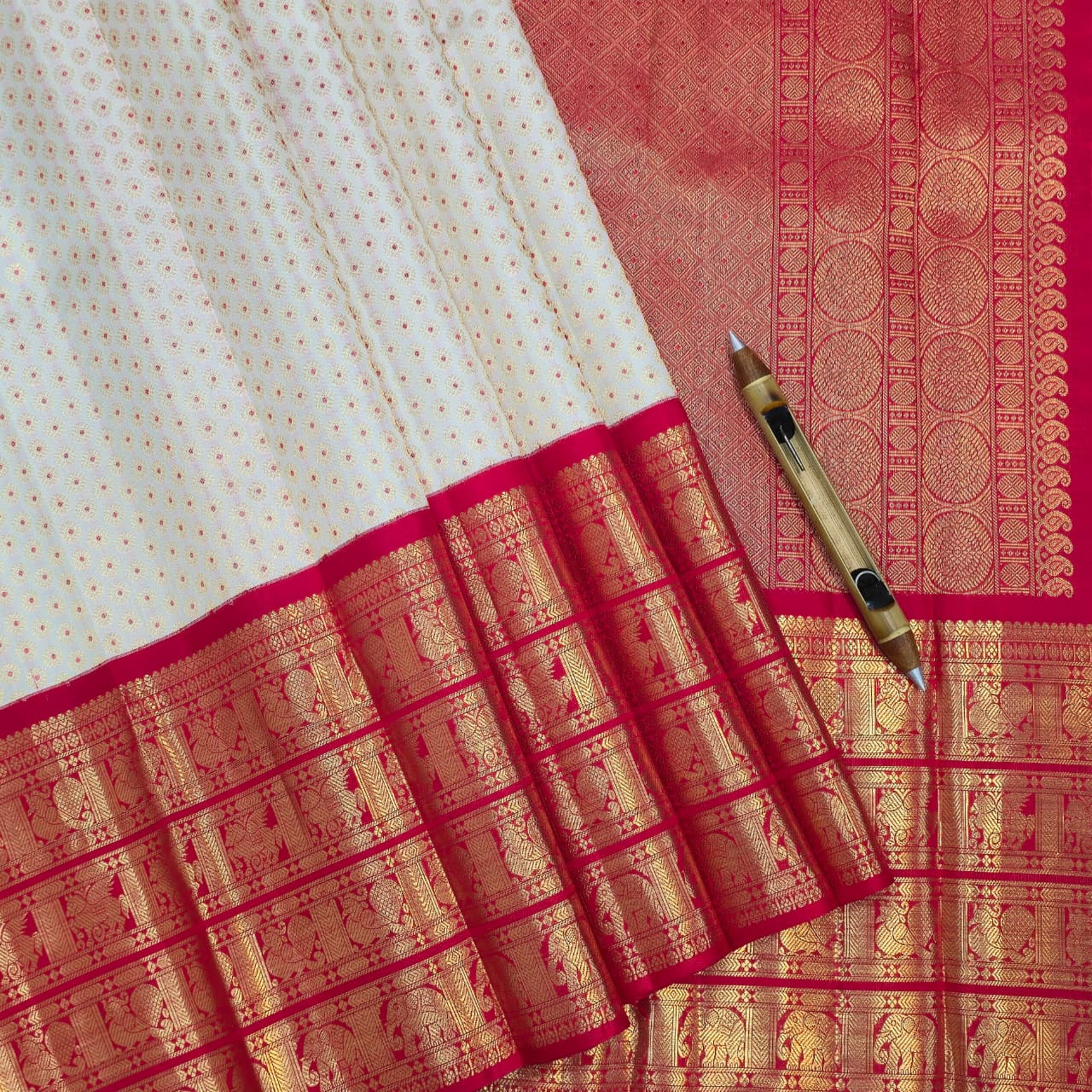 Ivory White & Rani Red Kanchipuram Silk Saree with Grand Temple Zari Border – Classic Bridal Heritage Collection